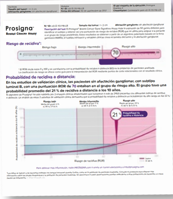 información clínica como tamaño tumoral y estado ganglionar a los datos genómicos, para brindar el grupo de riesgo y porcentaje de recidiva a 10 años.